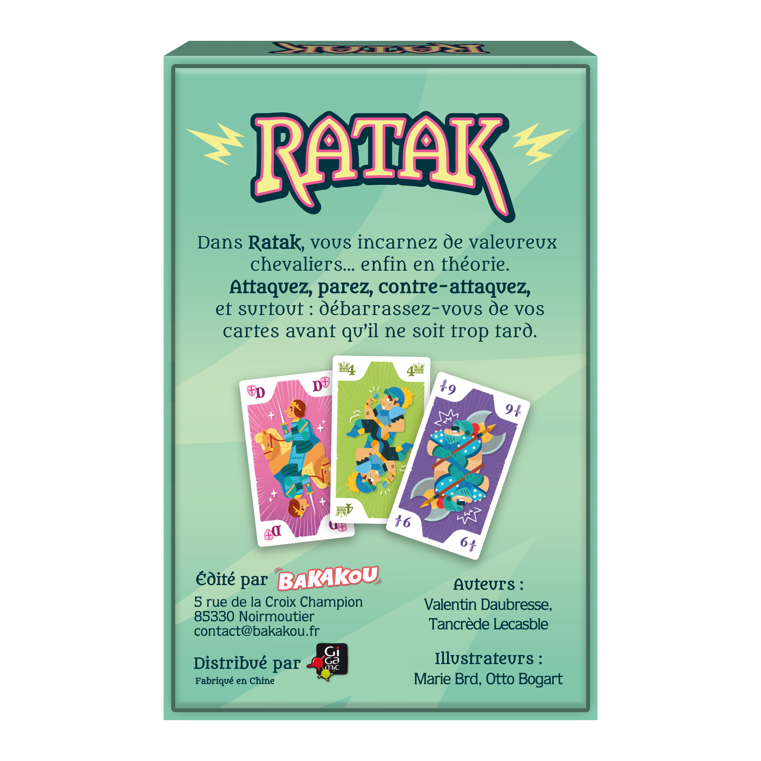 RATAK est un jeu d’ambiance rapide et tactique de défausse et de combat de cartes. Incarnez des chevaliers qui doivent se débarrasser de toutes leurs cartes en lançant des attaques et en se défendant contre celles des autres.
